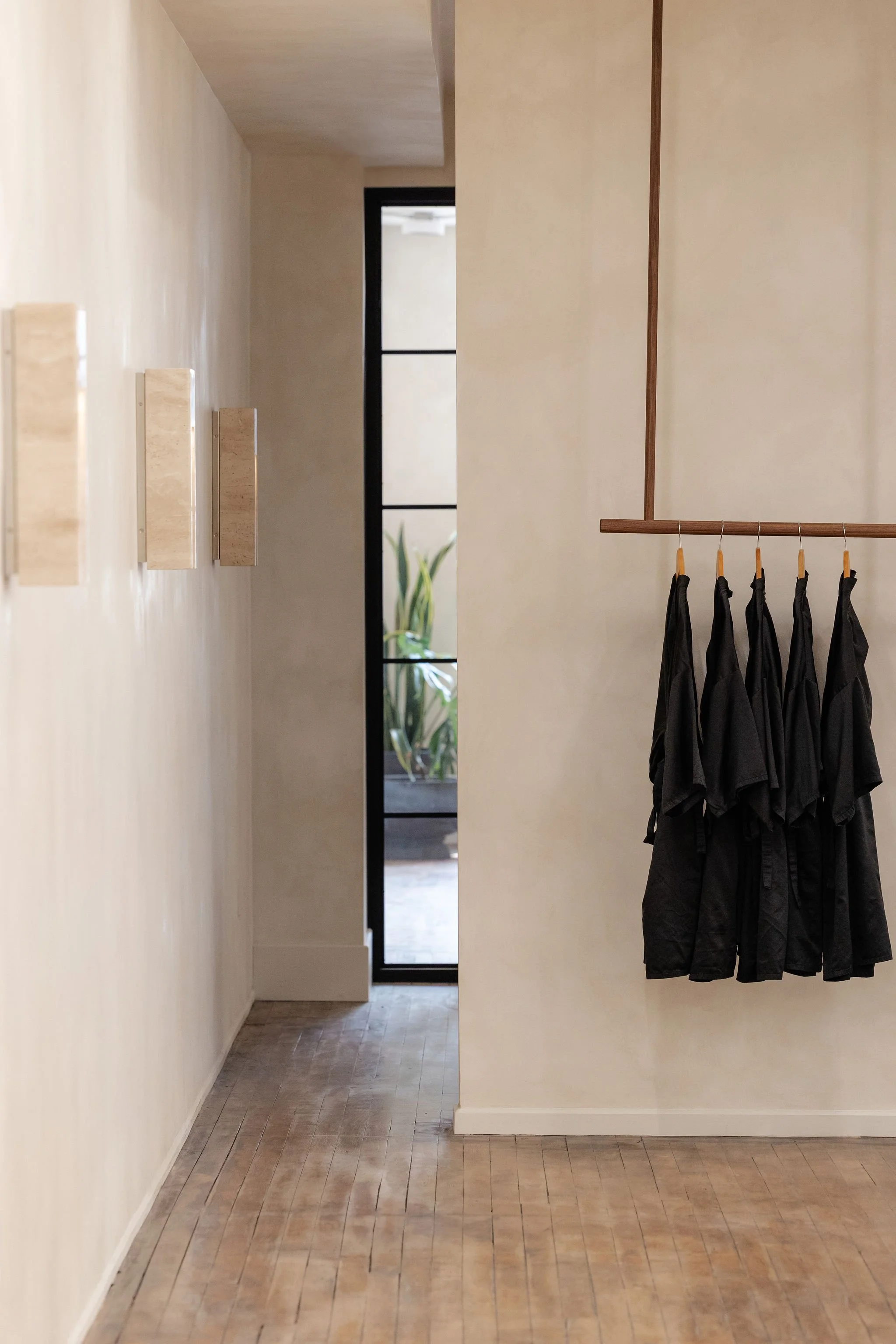 Instead of a closed closet (which wasn’t needed) in this entry space we opted for an ached niche with a be